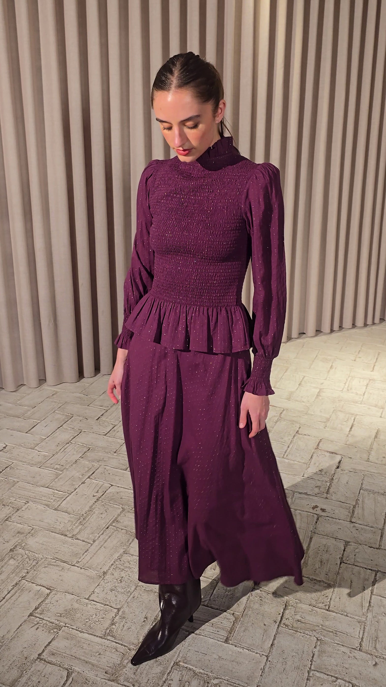 - Cintura alta (cubierta por el peplum del top)